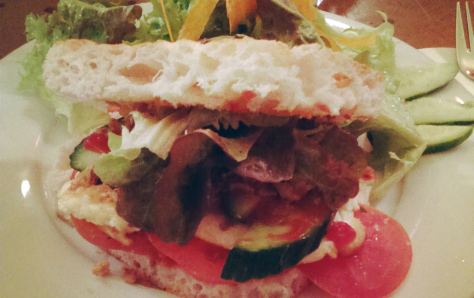 Ins Mata Hari geht man eigentlich nicht unbedingt um zu essen, denn es ist in Stuttgart ein sehr beliebter Anlaufspunkt um sich mit Freunden zu treffen um etwas zu trinken. Die Inneneinrichtung hat das Motto Shabby Chick und spätestens ab 20 Uhr ist der Laden voll und nur die wenigsten bekommen noch einen Sitzplatz. Ungewöhnlich ist es auch nicht, dass die Straße vor dem Mata Hari eigentlich immer voller Studenten ist, die ihr Getränk halten, weil es drinnen eben schon voll ist. Total Stuttgart eben. Aber man kann dort auch gut essen. Neben schwäbischen Spezialitäten, Panini und Co. auch einen Burger mit Käse der quietscht. Halloumi!