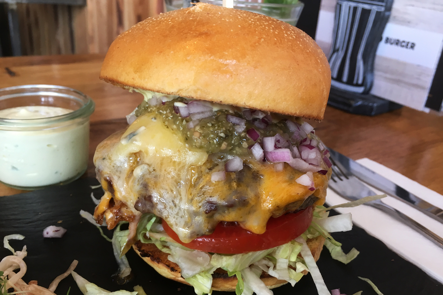 Die Angebotstafel gibt schon die erste Auskunft, die sich in der Speisekarte am Tisch wiederspiegelt. Hier wird die Messlatte hochgelegt, denn es wird alles selbst gemacht! Eine Auswahl reicht von bodenständigen bis ein paar exotischen Kreationen. Allen voran die vegetarischen Varianten hören sich vielversprechend an, ich entschied mich trotzdem für etwas Bodenständigeres. Der „Dreikäsehoch“ Burger sollte es sein. Kurze Zeit nach der Bestellung landete das Lüneburger Rind schon auf dem Grill. Mein Blick sah ein frisches Stück Fleisch und das erweckte natürlich gewisse Erwartungen in meinen Geschmacksknospen. Als dann mein Burger vor mir stand, war ich sehr angetan. Serviert auf einer Schieferplatte mit etwas Krautsalat war mein Gericht liebevoll in Szene gesetzt.